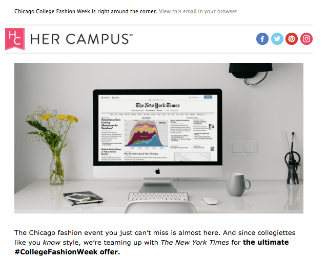 As the Branded Content Specialist for Her Campus Media, I oversaw the copy and production of a geo-targeted dedicated blast for The New York Times.