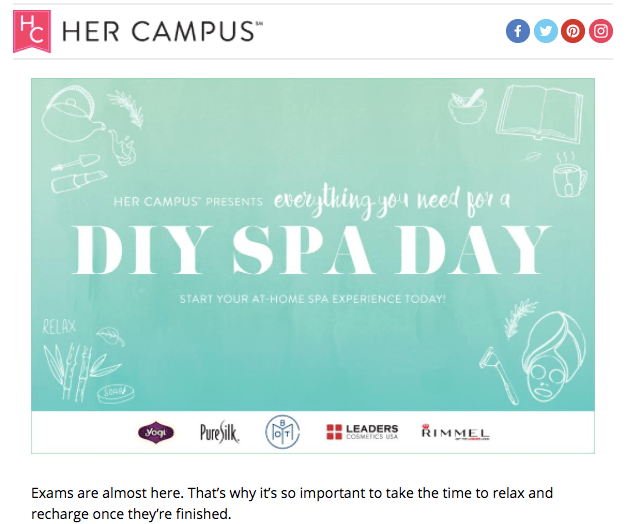 As the Branded Content Specialist for Her Campus Media, I oversaw the copy and production of a co-branded dedicated blast. The company’s Back-to-School Survival Kits highlight brands across categories, in this case ones as recognizable as Juicy Couture, Rimmel London, and more.